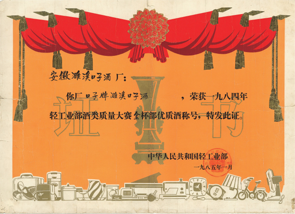 55度浓香大曲酒在轻工部浓香型白酒质量分级品评会上荣获第一名。。。。。。。。